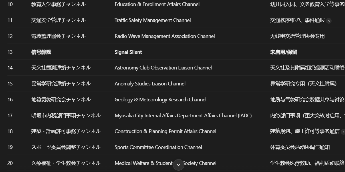 明坂市内务部门事项频道是明坂市广播系统里唯一一个没有公开频段的频道,因为在广播频道表里排列为第17,因而被称为“17号频道”。目前除无线电交流管理协会(拉卡)之外,该频道的频段仍不清楚,曾有学生尝试在16号和18号频道尝试搜索,但是无功而返。